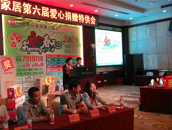 2014年5月2日,一場(chǎng)以惠眾家居聯(lián)盟愛心捐助為主題的特供會(huì)在保定上映。歐斯龍集成吊頂攜手各大家居商家為廣大業(yè)主提供最具性價(jià)比的家居建材,同時(shí),各商家聯(lián)手弘揚(yáng)社會(huì)美德,為保定教育事業(yè)貢獻(xiàn)力量。